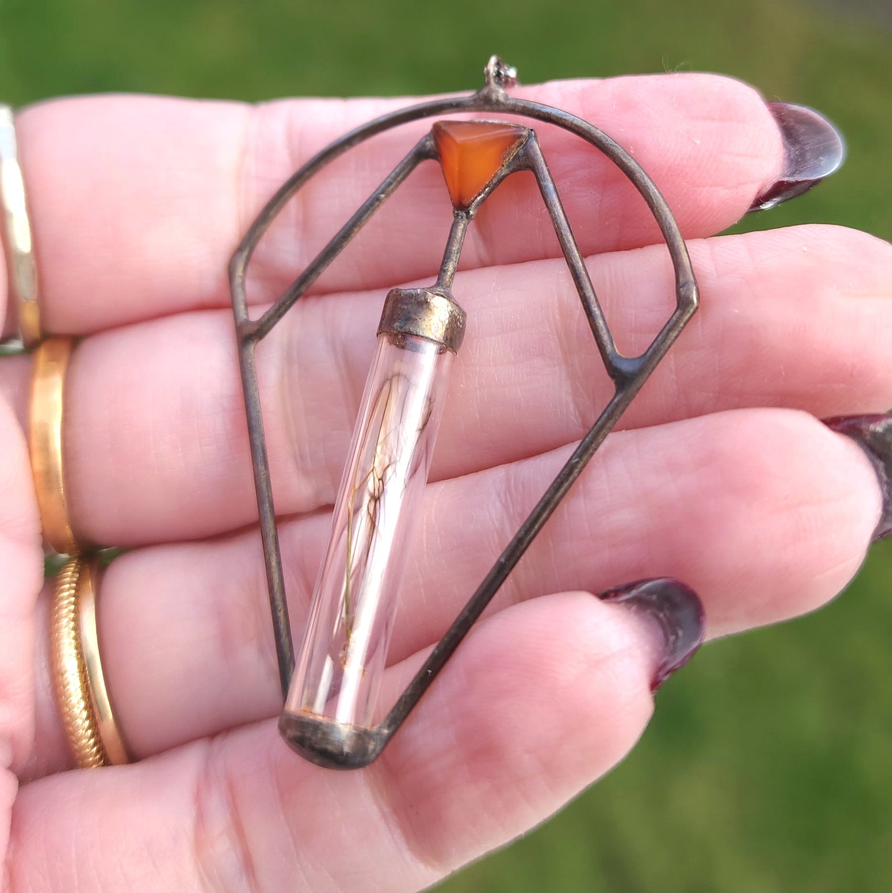 A: I use the Tiffany Method of stained glass soldering. The focal metal is a lead-free, nickel-free blend of silver and tin that melts at a lower temperature, allowing me to encase natural objects that are sensitive to heat.