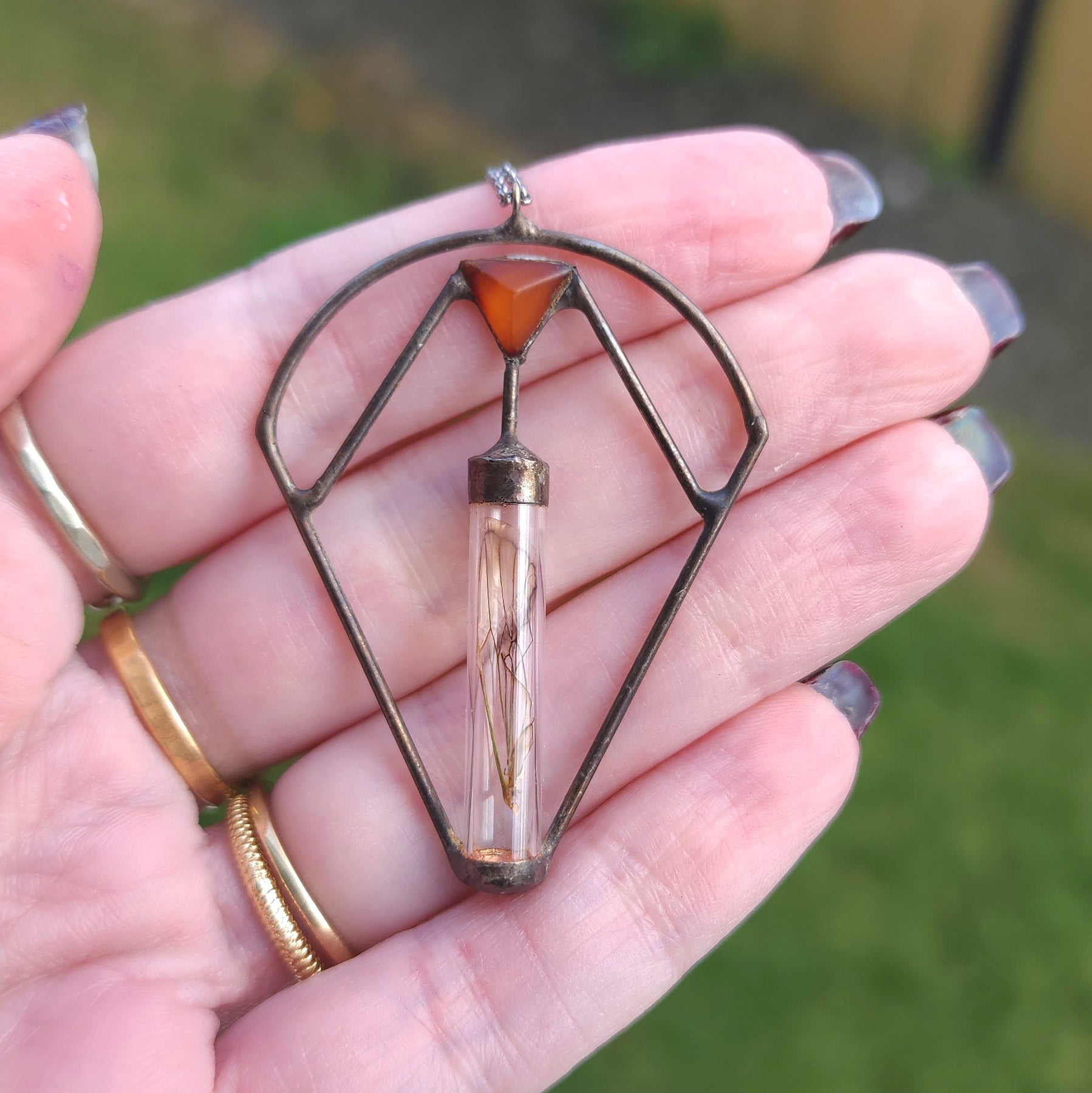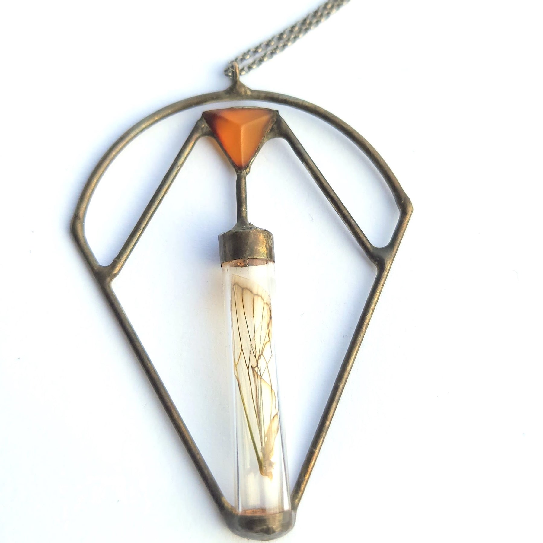 A: I use the Tiffany Method of stained glass soldering. The focal metal is a lead-free, nickel-free blend of silver and tin that melts at a lower temperature, allowing me to encase natural objects that are sensitive to heat.